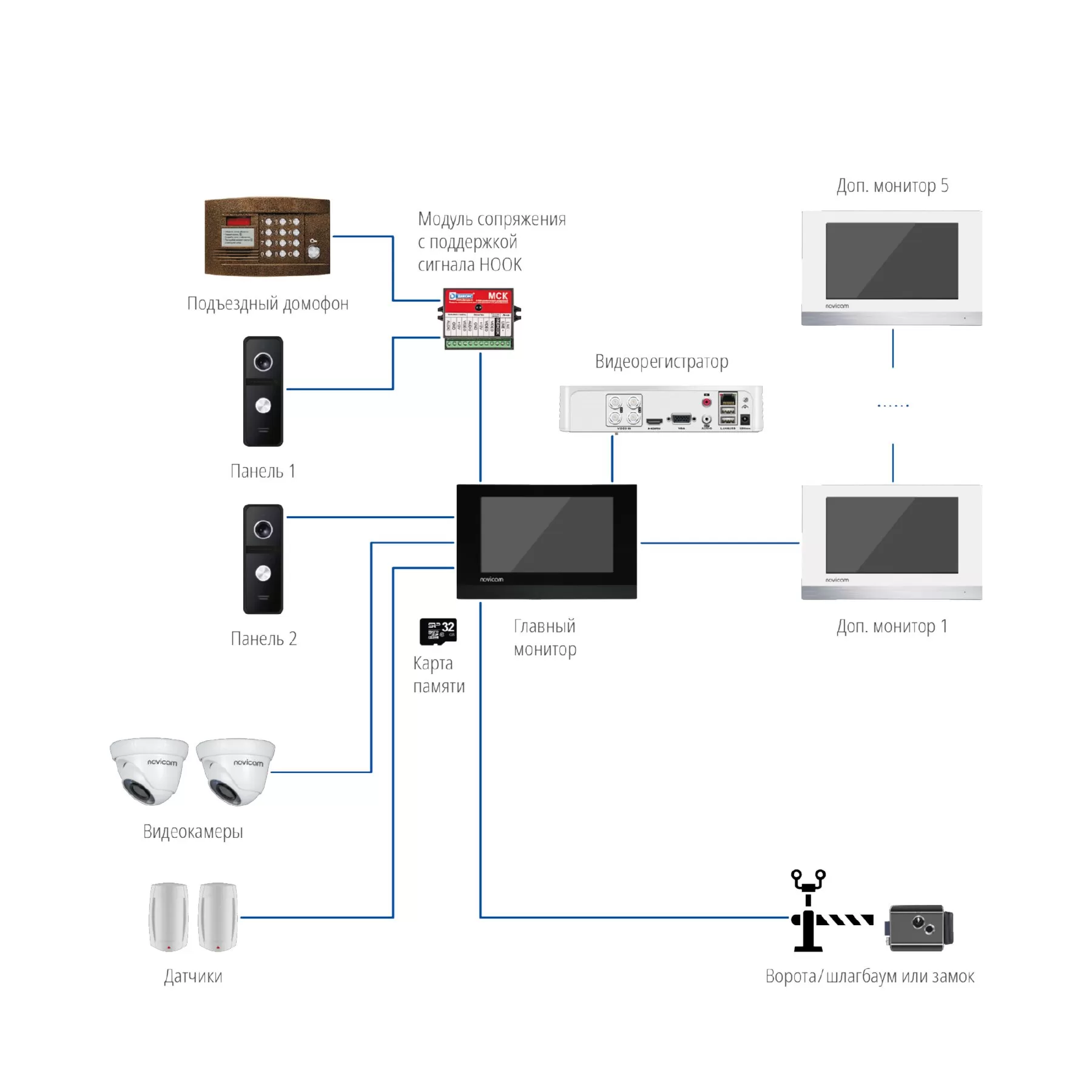Сенсорный 7" IPS дисплей дает красочное изображение практически при любых углах просмотра. Встроенные микрофон и динамик обеспечивают качественную двустороннюю аудиосвязь. К монитору можно подключить до 5 дополнительных мониторов или использовать его в качестве дополнительного к другим совместимым мониторам Novicam. При подключении нескольких мониторов становится доступной функция адресного интеркома. Это позволяет общаться в пределах одной системы, а также переадресовывать вызов с внешней панели на другой монитор.